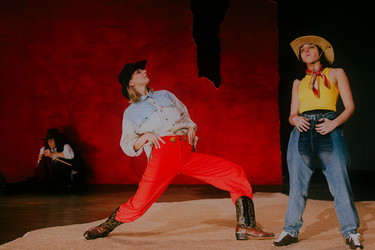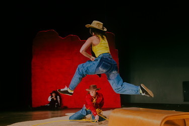 Die Performer*innen eignen sich die raue Körperlichkeit der Cowboys an. Sie machen sich auf der Bühne breit, handeln Grenzen aus, üben sich im coolen Lehnen, im Spucken und Fluchen. Sie agieren als Einzelkämpfer*innen, duellieren sich mit Wort- statt Schusswechseln und reiten dem Sonnenuntergang entgegen. Sie erforschen die Klischees des Western, scheitern an ihnen, führen sie ins Absurde und überwinden sie. Dabei machen sie sich auf die Suche nach einer wilden, lauten und trotzdem fürsorglichen Form der Verbundenheit.
