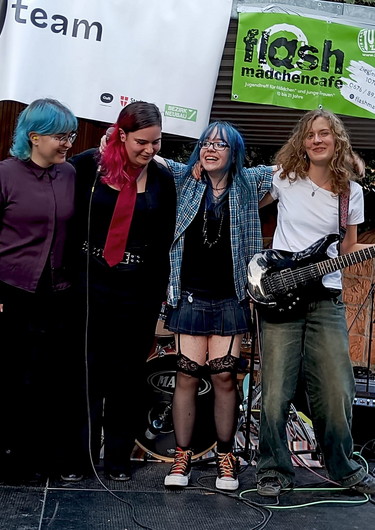 Mænic Pan!c – Die Band und nicht die Haarfarbe! Gegründet hat sich Mænic Pan!c im August 2025 beim Pink Noise Camp. Sie sind zwar eine relativ junge Band, aber spielten bereits zwei Konzerte: das Abschlusskonzert vom Pink Noise Camp und auf der, vom Flash Mädchen Café organisierten, Blockparty. Mænic Pan!c besteht aus vier Musiker*innen. Am Schlagzeug Lisa (sie/ihr). Als erste Gesangsstimme Mika (they/them) und spielt auch Bass, Miomi (keine Pronomen) singt mit Mika und spielt Keyboard/Synthesiser. Milena (sie/ihr) spielt die Gitarre der Band. Die Band sieht sich eher im Genre Rock, wollen sich aber nicht darauf beschränken, weshalb Mænic Pan!c vielfältige Lieder spielt. Im Moment hat Mænic Pan!c zwei selbst geschriebene und komponierte, live aufgeführte Songs. Die Texte sind sehr emotional und gefühlsgeladen, das ist genau das, wofür die Band steht. Das erste Lied „When Stars Die“ wurde am 11.10.2025 live im Campus Radio von St. Pölten gespielt, gemeinsam mit einem Interview der Bandmitglieder! Zu viert covert die Band auch gerne Hits, die der Band gefallen oder auch inspirieren, sowie „Smells Like Teen Spirit“ von Nirvana oder „Mr. Brightside“ von The Killers. Mænic Pan!c ist eine junge, emotional geladene Band, die sich gerne frei in Untergenres vom Rock ’n’ Roll bewegen. Mit ihren vier Mitgliedern sind sie bereit, jede Bühne zu rocken.