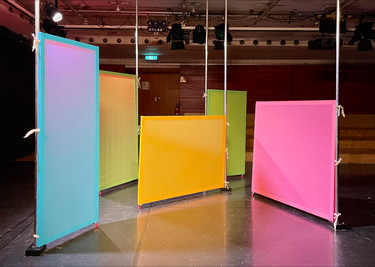 Fee-Valerie Böhme, Peter Fuchshuber und Mira Loeve laden ein in ein farbiges Labyrinth aus Licht und beweglichen Paneelen. Räume öffnen und schließen sich, Farbewände geben dir Halt und entschwinden im nächsten Moment wieder.