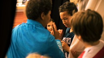 Im Anschluss an die Vorstellung können die Kinder selbst in Rollen schlüpfen, mit Stimme und Körper experimentieren und gemeinsam kleine Szenen entwickeln.