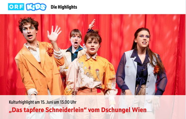 Am Samstag, den 15. Juni um 13.00 Uhr zeigt ORF KIDS die Dschungel-Wien-Produktion DAS TAPFERE SCHNEIDERLEIN. Die Sendung ist im Anschluss on demand auf ORF KIDS abrufbar.
