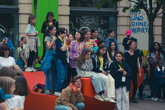 Kinder diskutieren ihre Rechte mit Politiker*innen und bringen ihre Anliegen mit der Regisseurin Sasha Davydova auf die Bühne. Teenager greifen zu Megafonen, um ihre Stimmen zu verstärken – damit hat Sylvi Kretzschmar, u.a. Leiterin des Megafon-Chores SIRENEN, seit Jahren gute Erfahrungen. Nestroypreisträger Thomas Perle, die Dramatikerin Armela Madreiter und die Schauspielerin und Elif Bilici unterstützen Jugendliche auf ihrer Spurensuche, die Stimmen und Perspektiven von Gastarbeiter*innen in Wien sichtbar zu machen. Mit ihren Erfahrungen aus der eigenen künstlerischen Praxis stärken Myassa Kraitt und Emily Chychy Joost marginalisierte junge Menschen, sodass diese digitale und theatrale Medien voller Humor und Kraft für ihre Themen einsetzen.